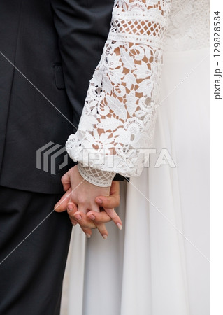 Wedding Couple Holding Hands Close-Up, Black Suit, White Lace Dress, Romantic Celebration, Intimate Moment, Details of Love, Marriage, Textured Fabrics.