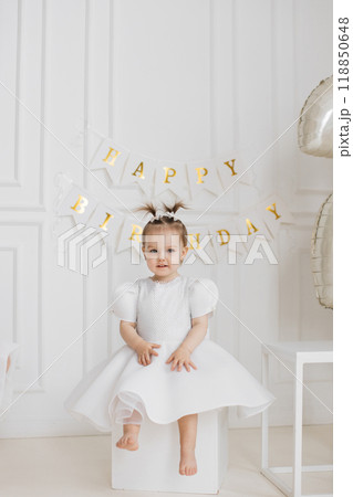 Adorable young girl celebrating birthday with decorations