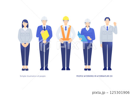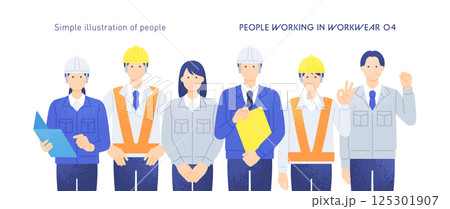 現場監督、技術者、事務員のイラストセット。作業服を着て働く男女のイラストセット。