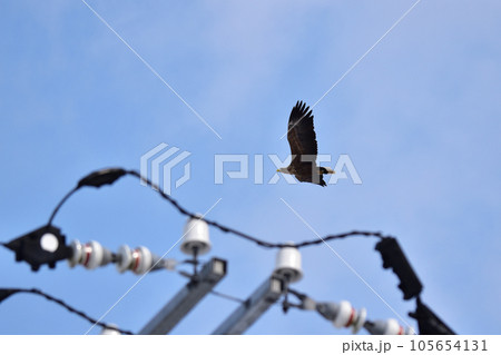 電線の上を飛ぶオジロワシ