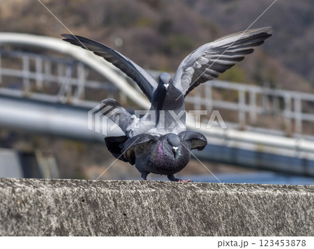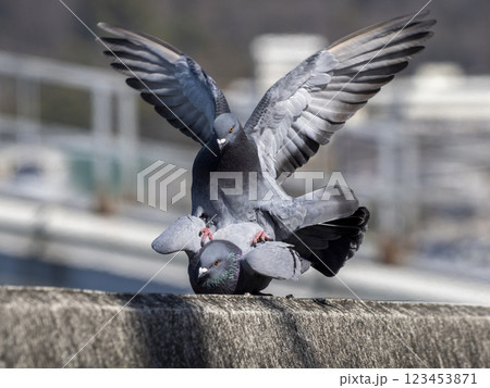 雌の背中にやさしく乗るハヤブサの雄、縦位置