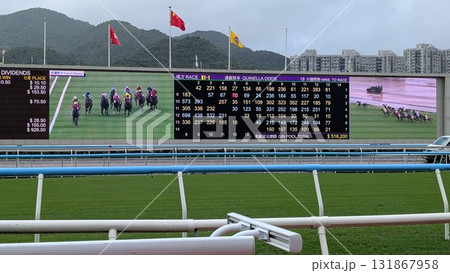 香港・沙田競馬場の大型スクリーンとレース映像