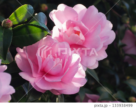 木漏れ日を浴びたピンクのオトメサザンカの花とつぼみ(乙女山茶花の花のクローズアップ)
