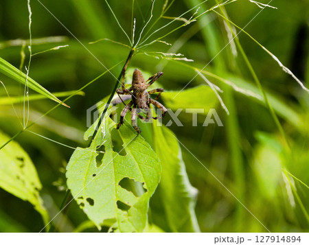 生き物 蜘蛛 ヘリジロオニグモ、三月の石垣島。海岸に続く牧草地で