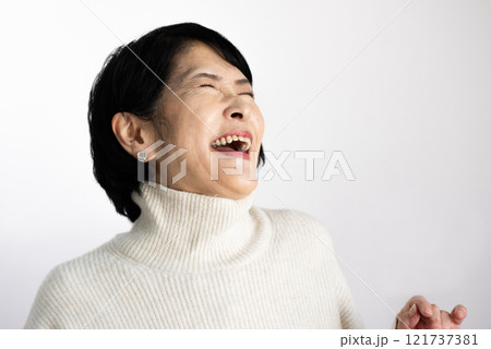 すっきりと書かれた紙を持ち口に手を添え笑う白いシャツを着たシニア女性