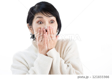 口に手を添えて何か言いたげなショートヘアの中年女性