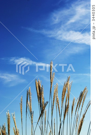 秋イメージ・ススキの花穂・深山の青バック横位置
