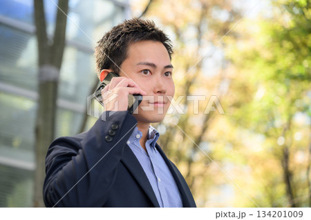 屋外で通話する男性