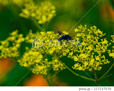 幸せの青い蜂 オミナエシで吸蜜するナミルリモンハナバチ