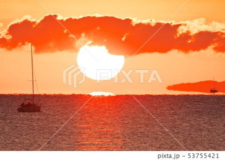 初日とヨットと蜃気楼により空中に浮かぶ島