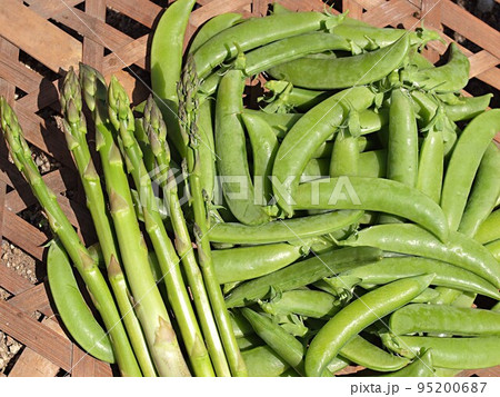 収穫したばかりのグリーンアスパラガスとスナップエンドウ