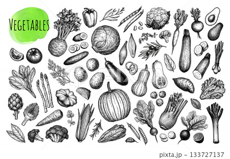 Big collection of vegetable ink sketches.