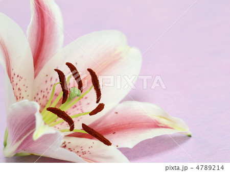 花の背景素材・ピンクの百合の優雅な花びらと褐色の蕊・横位置