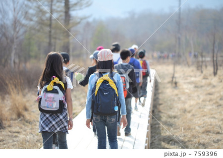 自然環境を学ぶ野外活動中の小学生のグループ SDGsへの取り組みを学ぶ