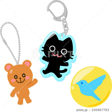 マスコット付きキーホルダーと缶バッジ、グッズ