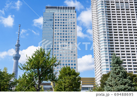 都市風景 錦糸公園から望むスカイツリーと高層ビル 東京都墨田区