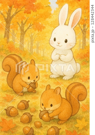 どんぐりを集めるリスたちと見守るウサギ