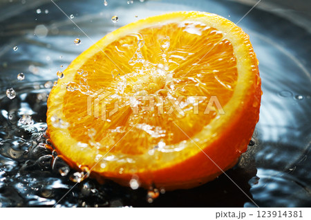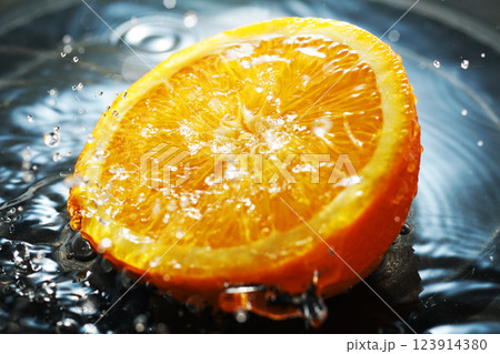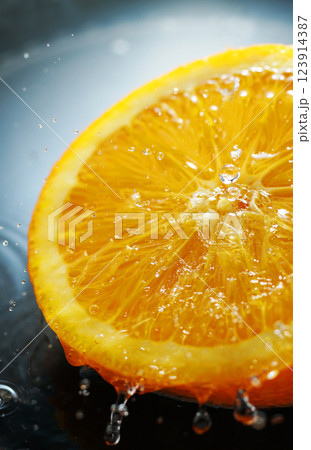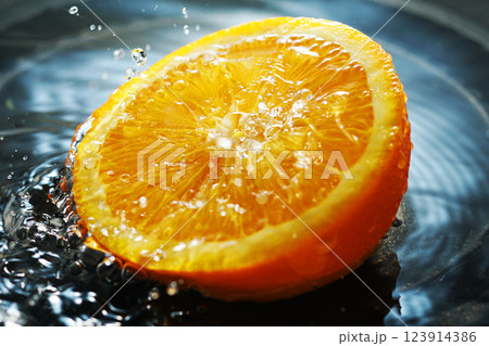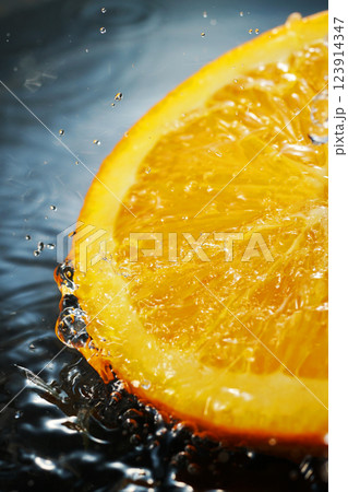 液体の中に入ったオレンジ フレッシュな果実のイメージ(AI生成画像)