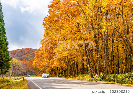 岐阜県高山市 秋の紅葉のせせらぎ街道を走る乗用車