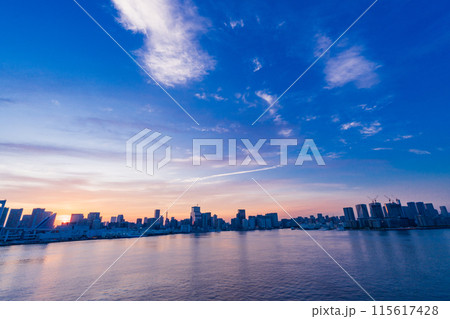 朝日焼けに包まれる新幹線の高架 交通イメージ