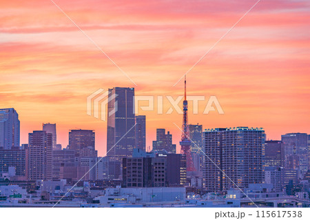 (東京都)レインボーブリッジ北側遊歩道から見る、夕焼け空に染まる東京タワー方面