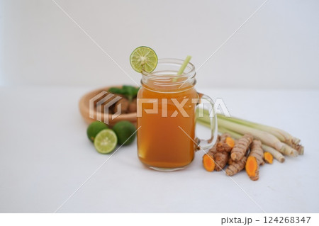 Fresh ginger and lemon juice in a glass jar with ginger roots on white background.