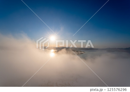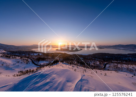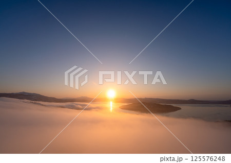 冬の屈斜路湖に昇る朝日と雲海