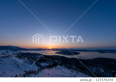 冬の屈斜路湖に昇る朝日