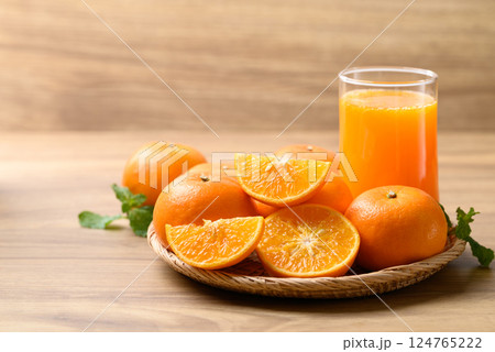Glass of orange juice and fresh orange fruit on wooden background, Healthy drink
