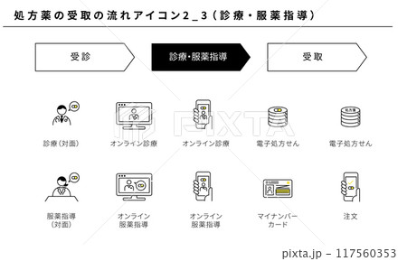 処方薬の受取の流れのシンプルアイコンセット素材2_3(診察・服薬指導)、ベクター