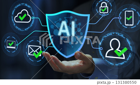 AIを活用したサイバーセキュリティ。AI搭載のSOAR。脅威検知とユーザー行動分析。盾とAIアイコン