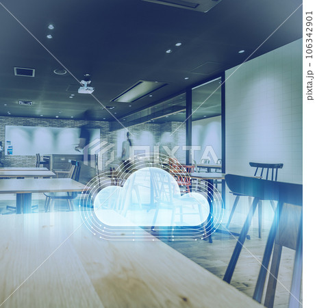 オフィスでノートパソコンを使うビジネスパーソンとクラウドコンピューティングのコンセプト