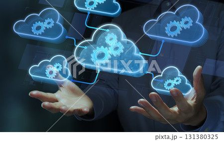 ノートパソコンを使う男性とクラウドコンピューティングのコンセプト