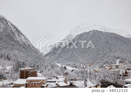 Great view of the snow rocky massif. Popular tourist attraction. Dramatic