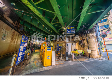 日本の東京都市景観 新橋駅前のオートバイ専用駐車場(公共駐車場・新橋三丁目オートバイ専用)