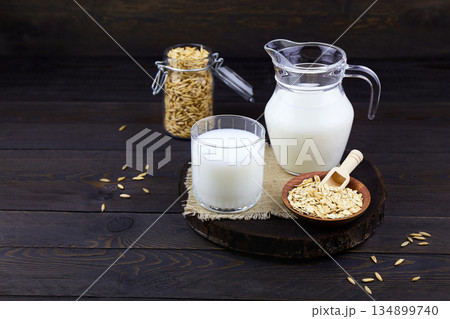 Oatmeal milk and oat flakes on a dark wooden background. Vegetable milk.