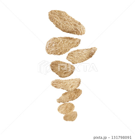 Corn flakes levitate on a white background