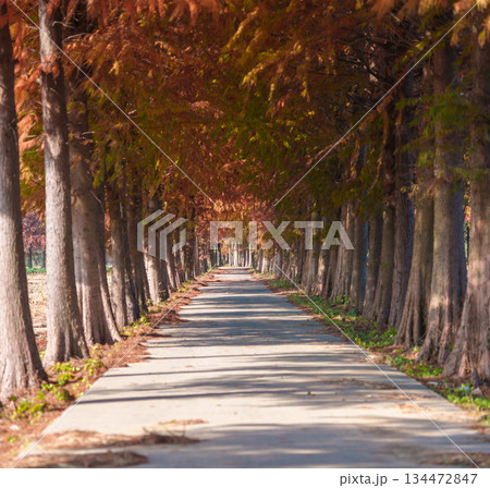 秋天的紅杉樹林蔭小徑