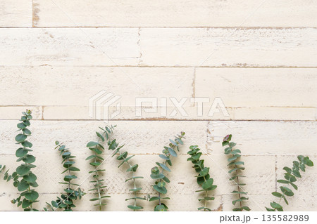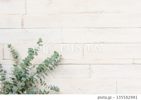 シャビーな木目とユーカリの背景素材