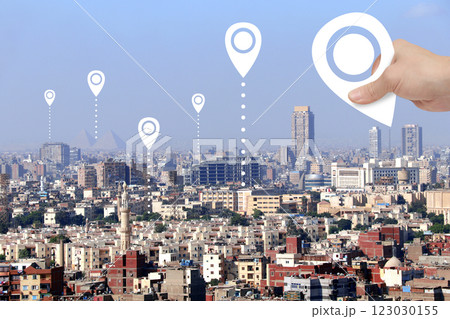 Planning a tourist trip. Top view of Cairo with Great Pyramids and hand with location pin. Travel way, point navigation concept. Global positioning system pin map. Modern travel, sightsee, tourism
