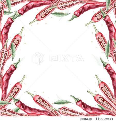 Square frame of branches with hot red peppers. Hand drawn isolated watercolor illustration of vegetables for tableware design, posters, cookbook illustration, fabric and clothing printing