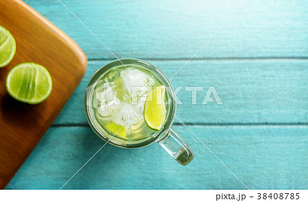 Cold lime soda in a glass on green background, Tropical and summer drink