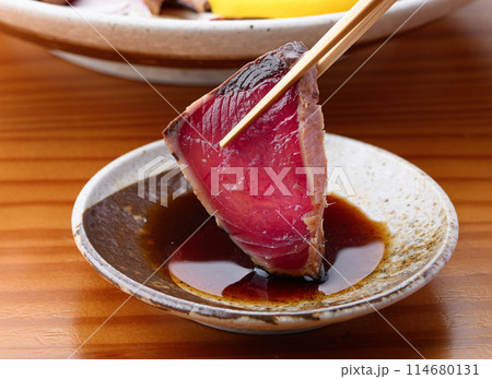 鰹のたたきをポン酢につける ( 南紀勝浦港 )