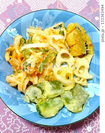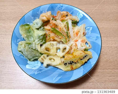 家庭の天ぷら(かき揚げ、レンコン、ピーマン、カボチャ)