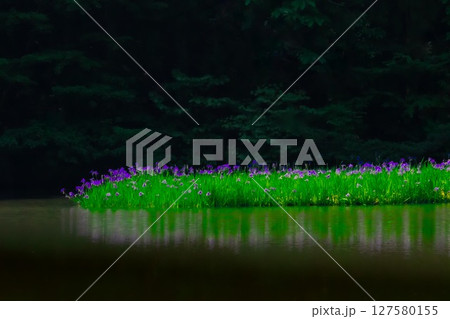 〔滋賀県高島市・5月〕箱館山の麓に位置する平池に群生するカキツバタ 水鏡の幻想