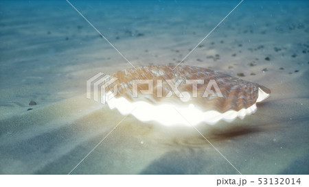 Mother of pearls underwater. Closed sea shell underwater self-luminous from the inside. Oysters and