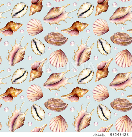 Seamless pattern with sea shells and conchs. Watercolor painting.