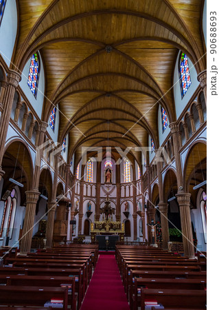 [九州・長崎] ステンドグラスの窓から聖フィリッポ西坂教会の室内を照らすカラフルな光。