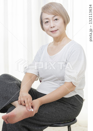 踵のカサつきにクリームを塗るシニア女性