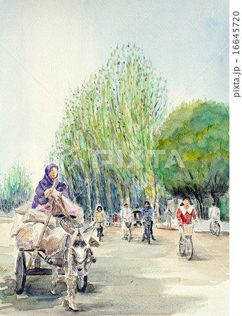 シルクロードの朝 中国旅行 ウイグル自治区 水彩画